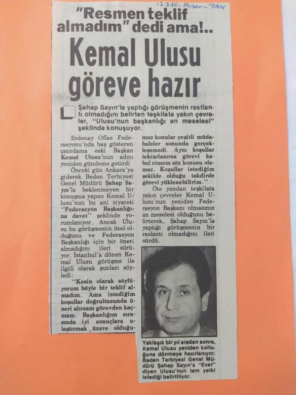 Kitap 1986 yılında yayınlanmıştır. 13 Temmuz 1986 - Tan Gazetesi - ''Resmen teklif almadım'' dedi ama!... - Kemal Ulusu göreve hazır - Şahap Sayın'la yaptığı görüşmenin rastlantı olmadığı belirten teşkilata yakın çevreler, ''Ulusu'nun başkanlığı an meselesi'' şeklinde konuşuyor - Gazete tam değil kupürüdür - 10x20cm ebatındadır.. adlı eser Türkçe dilindedir.