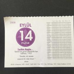 14 EYLÜL 2008-TAKVİM YAPRAĞI-DOĞUM GÜNÜ HEDİYESİ-KUVEYT TÜRK TAKVİMİ,TBMM DE GENEL SEFERBERLİK İLAN EDİLMESİ,1922,BÜTÜN AZALAR ORUÇ TUTMALI,HELAL HARAM NEDİR,RAMAZAN MANİSİ, en son 8 ay önce güncellenmiştir.