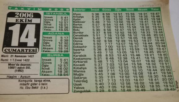 14 Ekim 2006-Orijinal Takvim Yaprağı-Doğum Günü-Söz,Nişan,Nikâh,Düğün ve Önemli Günler Hediyesi-Bizim Anadolu Takvimleri-Ayet(Hz.Ebubekir(r.a.))-Mısır'da deprem;1000'i aşkın ölü(1992)-Haşim,Aysun-Herşey Niçin Kusursuz?-Kur'anda Dua, en son 2 ay önce güncellenmiştir.