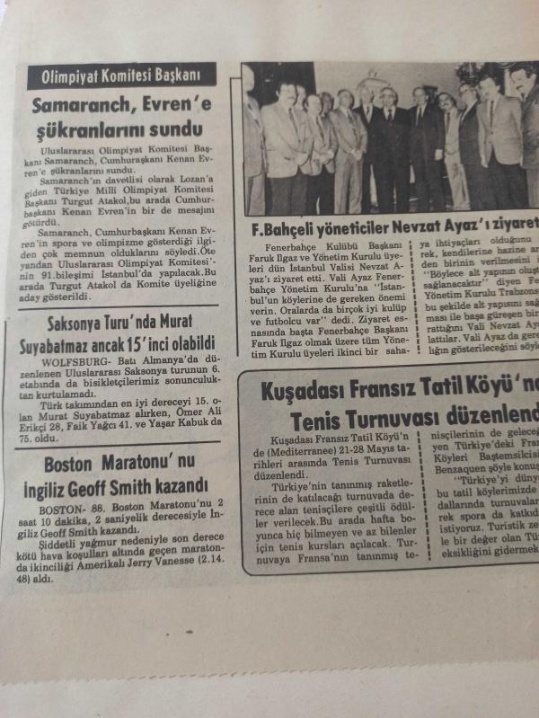 14 Mart 1984 - Samaranch, Kenan Evren'e şükranlarını sundu - Fenerbahçeli yöneticiler Nevzat Ayaz'ı ziyaret etti - Saksonya Turu'nda Murat Suyabatmaz ancak 15. olabildi - Gazete haberi - Tek Yaprak Arkalı Önlüdür adlı eser, Kitap > Süreli Yayınlar > Dergiler > Spor kategorisinde İkinci El olarak satıştadır.