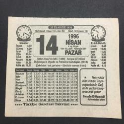 14 NİSAN 1996-TAKVİM YAPRAĞI-DOĞUM GÜNÜ HEDİYESİ-TÜRKİYE GAZETESİ TAKVİMİ,SAKIZ ADASININ FETHİ 1366,AVRUPA AT GÜNÜ,DOĞUBEYAZIT DİYADİN VE PATNOSUN KURTULUŞLARI 1918,, en son 8 ay önce güncellenmiştir.