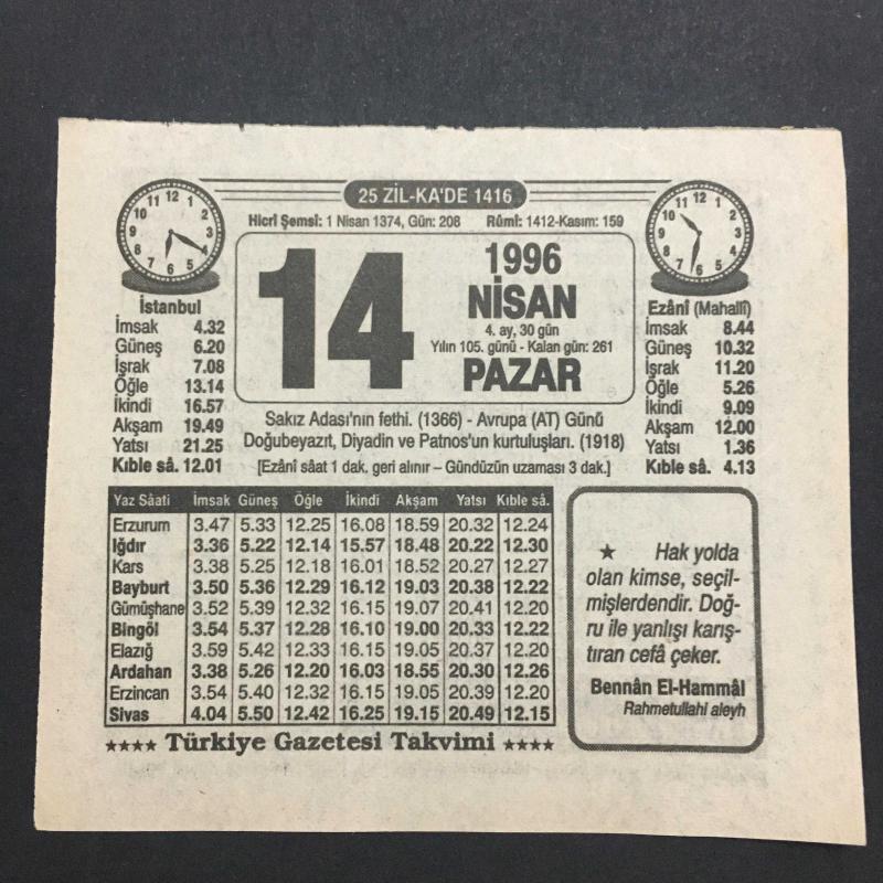 14 NİSAN 1996-TAKVİM YAPRAĞI-DOĞUM GÜNÜ HEDİYESİ-TÜRKİYE GAZETESİ TAKVİMİ,SAKIZ ADASININ FETHİ 1366,AVRUPA AT GÜNÜ,DOĞUBEYAZIT DİYADİN VE PATNOSUN KURTULUŞLARI 1918, başlıklı ürün, Efemera, Müzik, Sinema > Belge ve Evraklar > Takvimler kategorisi altında İkinci El olarak satılmaktadır.