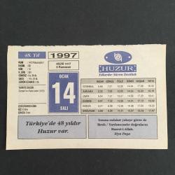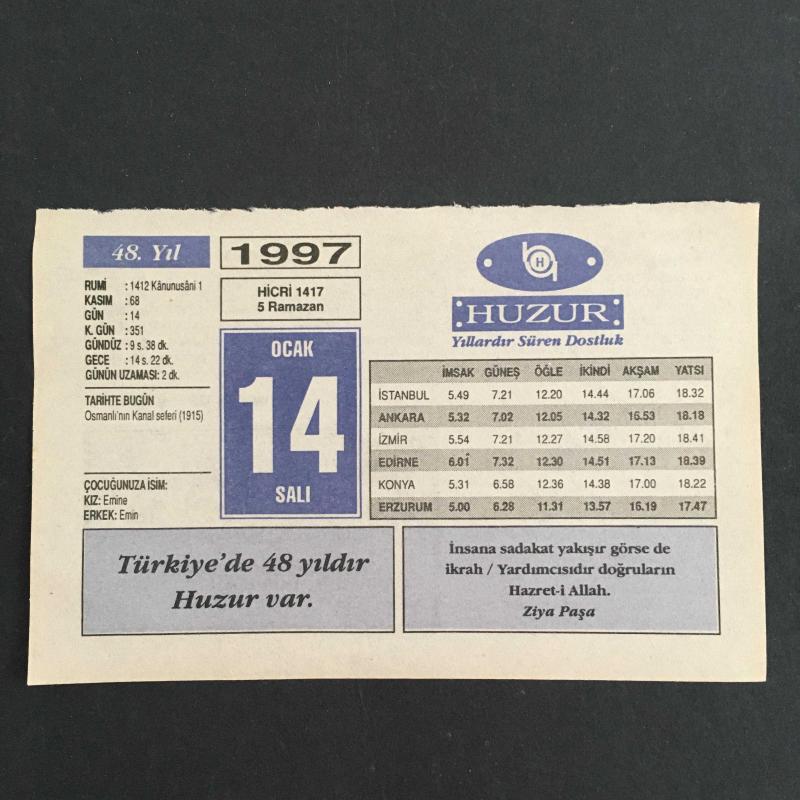 14 OCAK 1997-TAKVİM YAPRAĞI-DOĞUM GÜNÜ HEDİYESİ-HUZUR TAKVİMİ,OSMANLININ KANAL SEFERİ 1915,ÇOCUĞUNUZA İSİM,RAMAZAN AYI KAÇ GÜNDÜR,ELEKTRİKLİ SANDALYE başlıklı ürün, Efemera, Müzik, Sinema > Belge ve Evraklar > Takvimler kategorisi altında İkinci El olarak satılmaktadır.