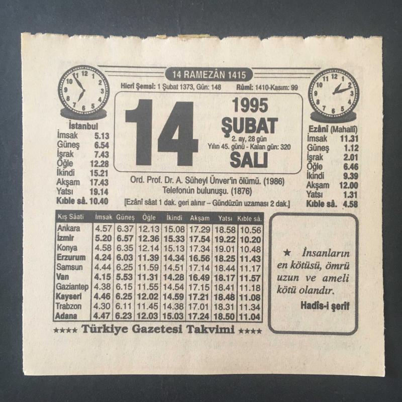 14 ŞUBAT 1995 -TAKVİM YAPRAĞI-DOĞUM GÜNÜ HEDİYESİ-TÜRKİYE GAZETESİ TAKVİMİ,ORD PROF DR A.SÜHEYL ÜNVERİN ÖLÜMÜ,1986,TELEFONUN BULUNUŞU 1876,DİN NEREDEN ÖĞRENİLİR,SUN İ ORTAKULAK, 11 ay önce satışa sunulmuştur.