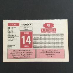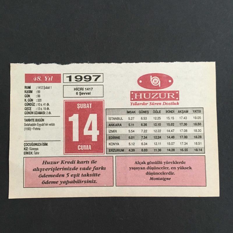 14 ŞUBAT 1997-TAKVİM YAPRAĞI-DOĞUM GÜNÜ HEDİYESİ-HUZUR TAKVİMİ,SELAHATTİN EYYÜBİNİN VEFATI,1193,FIRTINA,ÇOCUĞUNUZA İSİM,DUA AYETLERİNDEN SEÇMELER başlıklı ürün, Efemera, Müzik, Sinema > Belge ve Evraklar > Takvimler kategorisi altında İkinci El olarak satılmaktadır.
