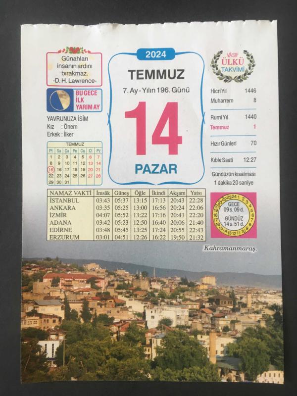 14 TEMMUZ 2024 -TAKVİM YAPRAĞI-DOĞUM GÜNÜ HEDİYESİ-VASIF ÜLKÜ TAKVİMİ,KAHRAMANMARAŞ,YAVRUNUZA İSİM,OSMANLI VİYANAYI 2.KEZ KUŞATTI 1683,TBMM İDAM CEZASINI KALDIRDI 2002,CAN BARSLAN,FERHAN ŞENSOY,, 1 yıl önce satışa sunulmuştur.