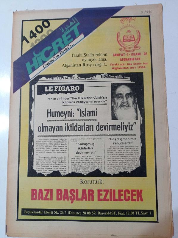 1400 Hicret Gazetesi - 17 Eylül 1979- Sayı 1 - Taraki Stalin Rolünü Oynuyor Ama Afganistan Rusya Değil - Humeyni İslam Olmayan İktidarları Devirmeliyiz - Fahri Korutürk Bazı Başlar Ezilecek - Mesud Barzani - Ali Bulaç- Hicret Olayı Ve İlk Cuma Namazı adlı eser Türkçe dilindedir.