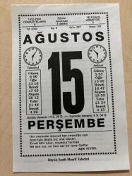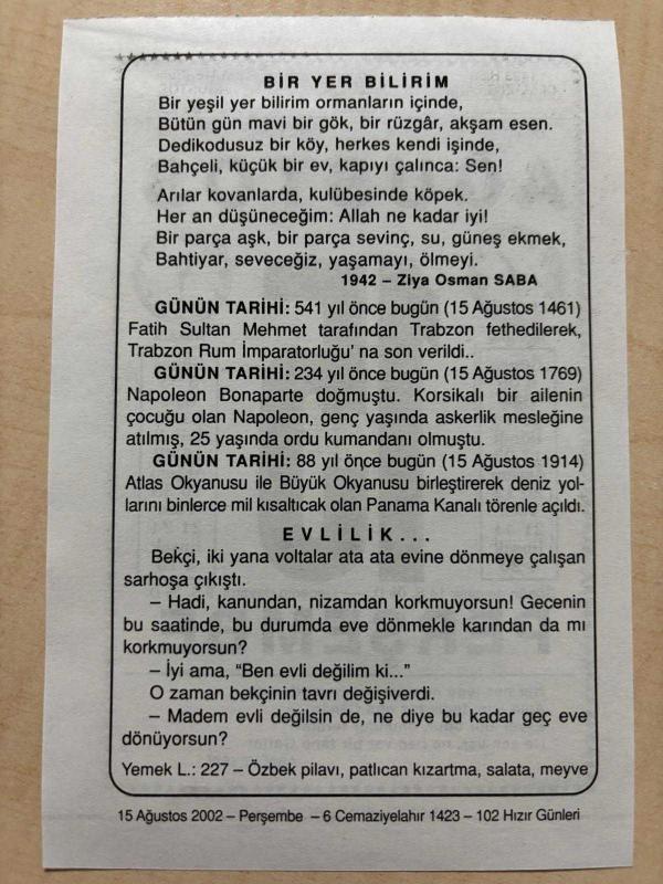 15 AĞUSTOS 2002 - TAKVİM YAPRAĞI - DOĞUM GÜNÜ HEDİYESİ - BÜYÜK SAATLİ MAARİF TAKVİMİ - AŞIK VEYSEL - ZİYA OSMAN SABA - FATİH SULTAN MEHMET'İN TRABZON'U FETHETMESİ - NAPOLEON BONAPARTE'NİN DOĞUMU - EVLİLİK ADLI YAZI, en son 8 ay önce güncellenmiştir.