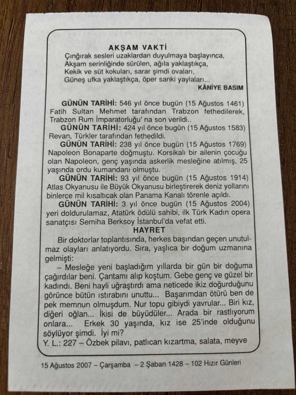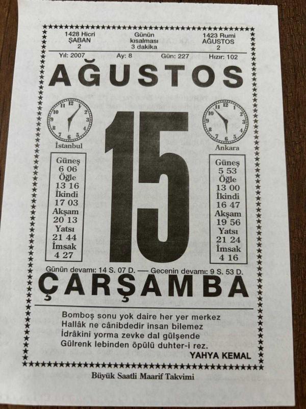 15 AĞUSTOS 2007 - TAKVİM YAPRAĞI - DOĞUM GÜNÜ HEDİYESİ - BÜYÜK SAATLİ MAARİF TAKVİMİ - YAHYA KEMAL - KANİYE BASIM - OPERA SANATÇISI SEMİHA BERKSOY VEFAT ETTİ - FATİH SULTAN MEHMET'İN TRABZON'U FETHETMESİ - NAPOLEON BONAPARTE'NİN DOĞUMU - PANAMA KANALI AÇILDI, en son 8 ay önce güncellenmiştir.