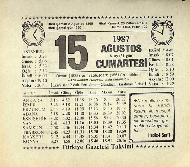 15 Ağustos 1987 Takvim Yaprağı - Doğum Günü Hediyesi EFMN13858, en son 21 gün önce güncellenmiştir.