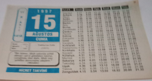 15 Ağustos 1997-Orijinal Takvim Yaprağı-Doğum Günü-Söz,Nişan,Nikâh,Düğün ve Önemli Günler Hediyesi-Hicret Takvimi-Ayet(Hadis)-(Müslim)-Trablus'un Fethi(1551)-Hemoglobin-Kabızlık-Latin Atasözü başlıklı ürün, Efemera, Müzik, Sinema > Belge ve Evraklar > Takvimler kategorisi altında İkinci El olarak satılmaktadır.