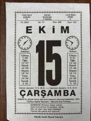 15 EKİM 2003 - TAKVİM YAPRAĞI - DOĞUM GÜNÜ HEDİYESİ - BÜYÜK SAATLİ MAARİF TAKVİMİ - GAZİ MUSTAFA KEMAL CHP KURULTAYINDA BÜYÜK NUTUK ADLI ESERİNİ OKUMAYA BAŞLADI - BEKTAŞİLERİN HALİFE BABASI TURGUT KOC İSTANBUL'DA VEFAT ETTİ - AŞIKLAR GÜNÜ VE BAYRAMI - KADIN CASUS MATA-HARİ ÖLDÜRÜLDÜ başlıklı ürün, Efemera, Müzik, Sinema > Belge ve Evraklar > Takvimler kategorisi altında İkinci El olarak satılmaktadır.