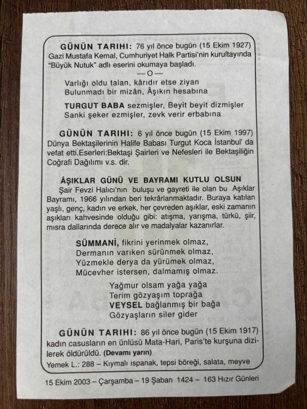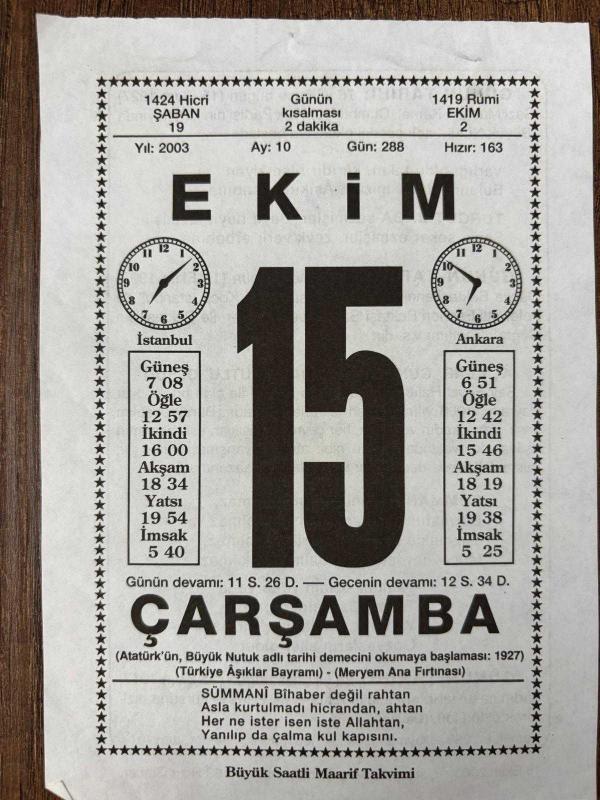 15 EKİM 2003 - TAKVİM YAPRAĞI - DOĞUM GÜNÜ HEDİYESİ - BÜYÜK SAATLİ MAARİF TAKVİMİ - GAZİ MUSTAFA KEMAL CHP KURULTAYINDA BÜYÜK NUTUK ADLI ESERİNİ OKUMAYA BAŞLADI - BEKTAŞİLERİN HALİFE BABASI TURGUT KOC İSTANBUL'DA VEFAT ETTİ - AŞIKLAR GÜNÜ VE BAYRAMI - KADIN CASUS MATA-HARİ ÖLDÜRÜLDÜ, en son 8 ay önce güncellenmiştir.
