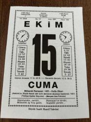 15 EKİM 2004 - TAKVİM YAPRAĞI - DOĞUM GÜNÜ HEDİYESİ - BÜYÜK SAATLİ MAARİF TAKVİMİ - HZ.MUHAMMED - ŞERAFETTİN YALTKAYA - RAMAZAN NASIL TESPİT EDİLİRDİ - GAZİ MUSTAFA KEMAL CHP KURULTAYINDA BÜYÜK NUTUK ADLI ESERİNİ OKUMAYA BAŞLADI - BEKTAŞİLERİN HALİFE BABASI TURGUT KOC İSTANBUL'DA VEFAT ETTİ, en son 8 ay önce güncellenmiştir.