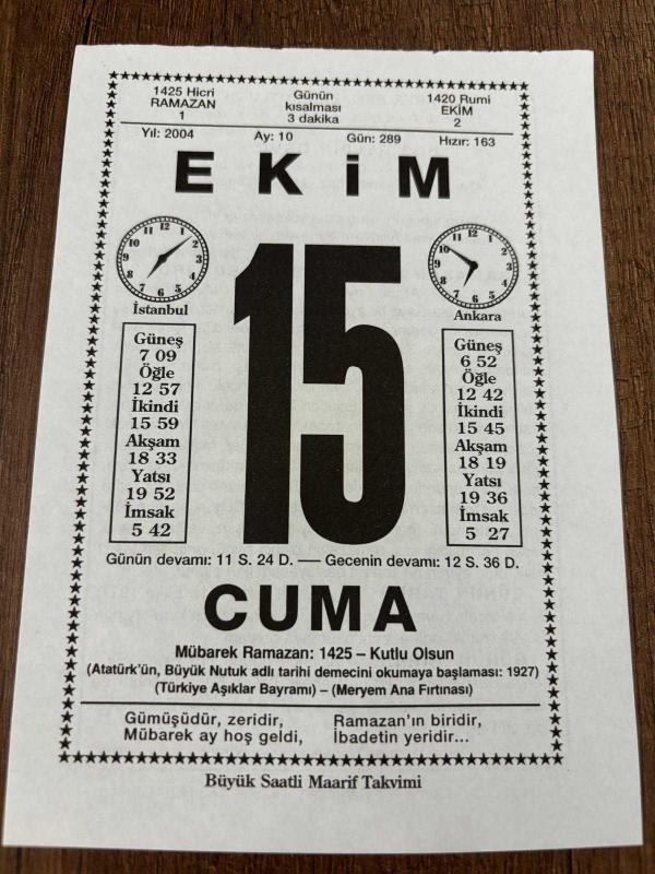 15 EKİM 2004 - TAKVİM YAPRAĞI - DOĞUM GÜNÜ HEDİYESİ - BÜYÜK SAATLİ MAARİF TAKVİMİ - HZ.MUHAMMED - ŞERAFETTİN YALTKAYA - RAMAZAN NASIL TESPİT EDİLİRDİ - GAZİ MUSTAFA KEMAL CHP KURULTAYINDA BÜYÜK NUTUK ADLI ESERİNİ OKUMAYA BAŞLADI - BEKTAŞİLERİN HALİFE BABASI TURGUT KOC İSTANBUL'DA VEFAT ETTİ