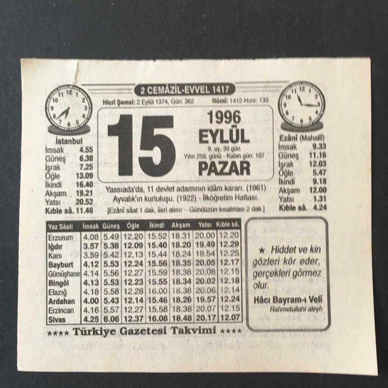 15 EYLÜL 1996 -TAKVİM YAPRAĞI-DOĞUM GÜNÜ HEDİYESİ-TÜRKİYE GAZETESİ TAKVİMİ,YASSIADA DA 11 DEVLET ADAMININ İDAM KARARI,1961,AYVALIKIN KURTULUŞU 1922,İLKÖĞRETİM HAFTASI başlıklı ürün, Efemera, Müzik, Sinema > Belge ve Evraklar > Takvimler kategorisi altında İkinci El olarak satılmaktadır.
