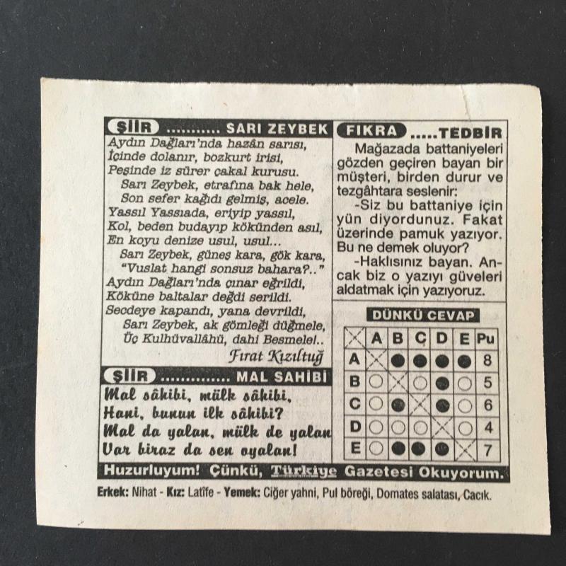 Gazeteler,dergiler,kitaplar harika hediyelerdir.Otantik,orijinal,nadir ve eski gazeteler,dergiler,kitaplar,efemeralar,objeler.Gazeteler bir aynadır.Kitaplar sadece okumak için değil birlikte yaşamak içindir . Kelimeler , notalar , sayılar kardeştirler.Kitaplar insanı binbir gözlü yapar.