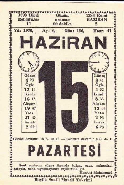 15 HAZİRAN 1970 SAATLİ MAARİF TAKVİMİ YAPRAĞI, en son 1 yıl önce güncellenmiştir.