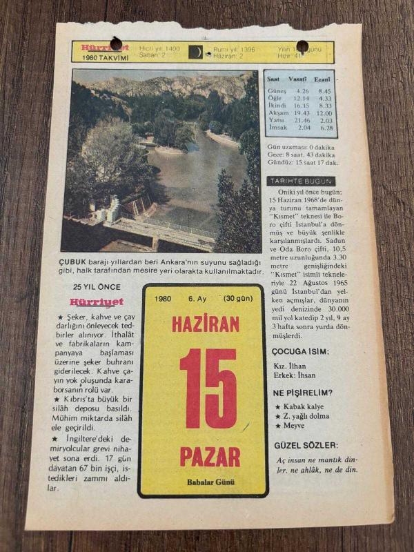 15 HAZİRAN 1980 - TAKVİM YAPRAĞI - DOĞUM GÜNÜ HEDİYESİ - HÜRRİYET TAKVİMİ - DESTAN GİBİ ADLI ROMAN - Romancı Peyami Safa'nın ölümü (1961) - Pazarola Hasan Bey'in ölümü (1926) - Darüşşafaka'nın kuruluşu (1873) başlıklı ürün, Efemera, Müzik, Sinema > Belge ve Evraklar > Takvimler kategorisi altında İkinci El olarak satılmaktadır.