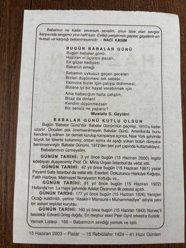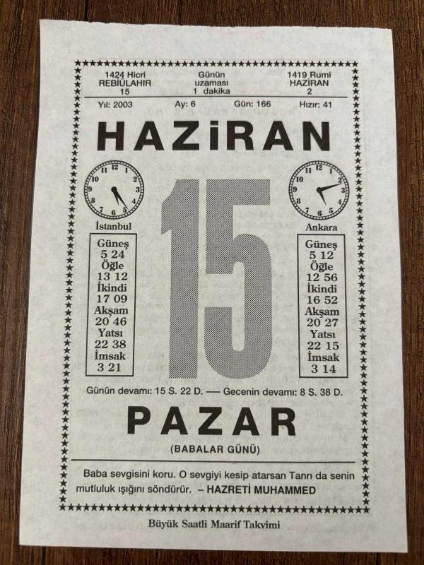 15 HAZİRAN 2003 - TAKVİM YAPRAĞI - DOĞUM GÜNÜ HEDİYESİ - BÜYÜK SAATLİ MAARİF TAKVİMİ - HZ.MUHAMMED - NACİ KASIM - MUSTAFA S.GEYLANİ - BABALAR GÜNÜ KUTLU OLSUN - YENİÇERİ OCAĞI KALDIRILDI - NORVEÇ'Lİ BESTEKAR EDVARD GRİEG DOĞDU - HOLLANDA'NIN LA HAYE ŞEHRİNDE ADALET DİVANININ İLK CELSESİ AÇILDI - YAZAR PEYAMİ SAFA VEFAT ETTİ - PROF. DR. MİNA URGAN VEFAT ETTİ, en son 8 ay önce güncellenmiştir.