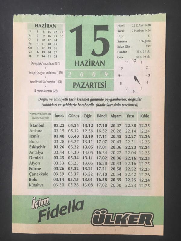 15 HAZİRAN 2009 -TAKVİM YAPRAĞI-DOĞUM GÜNÜ HEDİYESİ-ÜLKER TAKVİMİ,DARUŞŞAFAKANIN AÇILIŞI 1873,YENİÇERİ OCAĞININ KALDIRILMASI,1826,PEYAMİ SEFA NIN VEFATI 1961,İLK EZANIN OKUNMASI 622,YENİ AYAKKABI,ÇOCUĞUNUZUN İSMİ,ÇİÇEK AŞISINI KİM TANITTI başlıklı ürün, Efemera, Müzik, Sinema > Belge ve Evraklar > Takvimler kategorisi altında İkinci El olarak satılmaktadır.