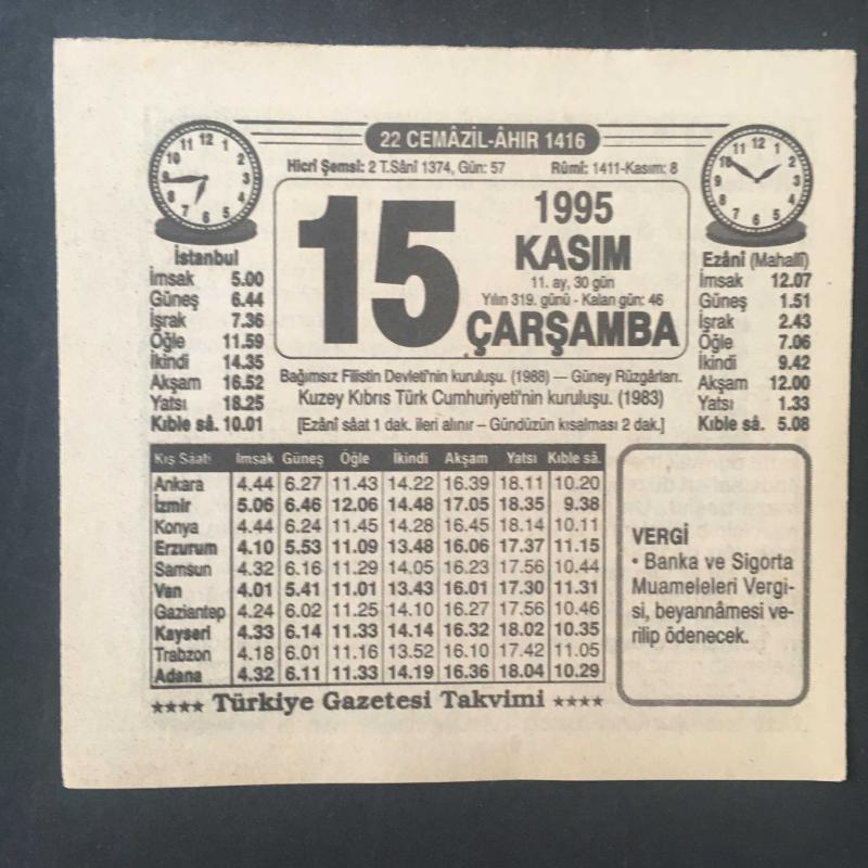 15 KASIM 1995 -TAKVİM YAPRAĞI-DOĞUM GÜNÜ HEDİYESİ-TÜRKİYE GAZETESİ TAKVİMİ,BAĞIMSIZ FİLİSTİN DEVLETİNİN KURULUŞU,1988,GÜNEY RÜZGARLARI,KKTC NİN KURULUŞU 1983,, en son 8 ay önce güncellenmiştir.
