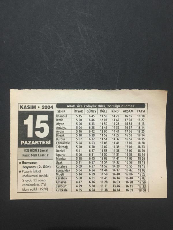 15 KASIM 2004-TAKVİM YAPRAĞI-DOĞUM GÜNÜ HEDİYESİ,RAMAZAN BAYRAMI 2. GÜN,POZANTI İSTİKLAL MAHKEMESİ KURULDU,2 AYDA 32 SANIĞI CEZALANDIRILDI,7 Sİ İDAM EDİLDİ,1920,NAMAZ İLE ZEKAT, en son 8 ay önce güncellenmiştir.