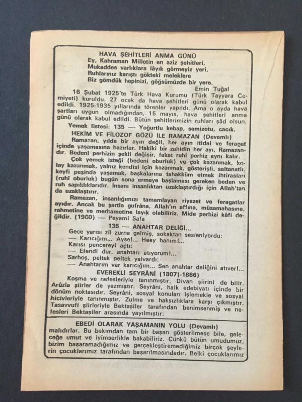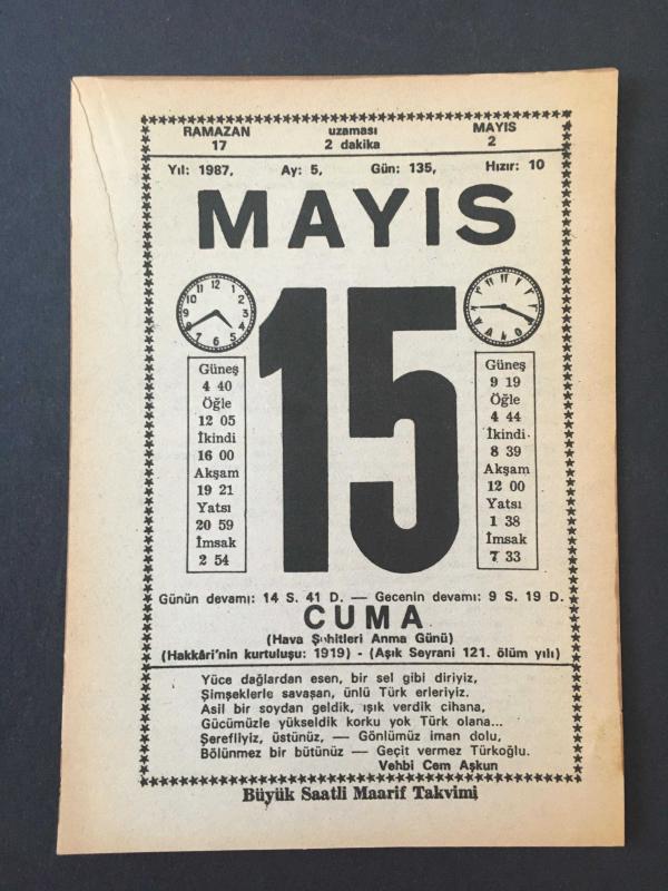 15 MAYIS 1987 -TAKVİM YAPRAĞI-DOĞUM GÜNÜ HEDİYESİ-BÜYÜK SAATLİ MAARİF TAKVİMİ,HAVA ŞEHİDLERİ ANMA GÜNÜ,HAKKARİNİN KURTULUŞU ,1919,AŞIK SEYRANİ 121.ÖLÜM YILI,HEKİM VE FİLOZOF GÖZÜ İLE RAMAZAN,ANAHTAR DELİĞİ,EVEREKLİ SEYRANİ,1807-1866,EBEDİ OLARAK YAŞAMANIN YOLU, en son 8 ay önce güncellenmiştir.