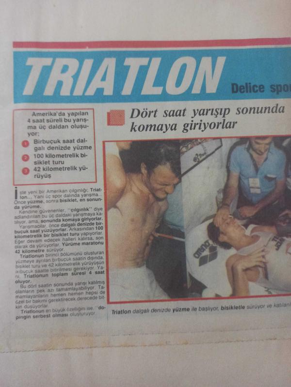 15 Mart 1984 - Triatlon - Dört saat yarışıp sonunda komaya giriyorlar - Amerika'da yapılan 4 saat süreli bu yarışma üç daldan oluşuyor: 1. Bir buçuk saat dalgalı denizde yüzme 2. 100 kilometrelik bisiklet turu 3. 42 kilometrelik yürüyüş - Gazete haberi - Tek Yaprak Arkalı Önlüdür adlı eser, Kitap > Süreli Yayınlar > Dergiler > Spor kategorisinde İkinci El olarak satıştadır.