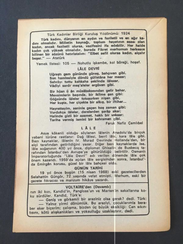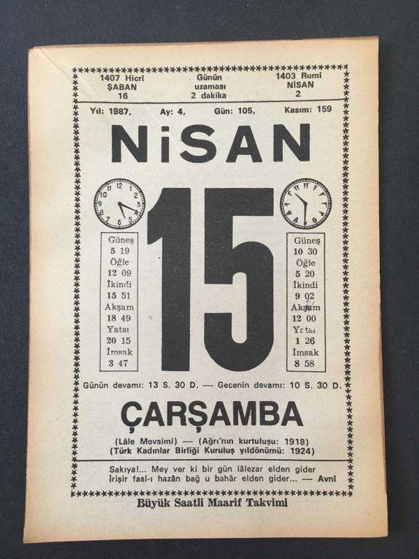 15 NİSAN 1987 -TAKVİM YAPRAĞI-DOĞUM GÜNÜ HEDİYESİ-BÜYÜK SAATLİ MAARİF TAKVİMİ,LALE MEVSİMİ ,AĞRININ KURTULUŞU,1918,TÜRK KADINLAR BİRLİĞİ KURULUŞ YILDÖNÜMÜ 1924,LALE DEVRİ,LALE,SELAHADDİN GÜNGÖR VEFAT ETTİ,15 NİSAN 1968,VOLTAİRE DEN, en son 8 ay önce güncellenmiştir.