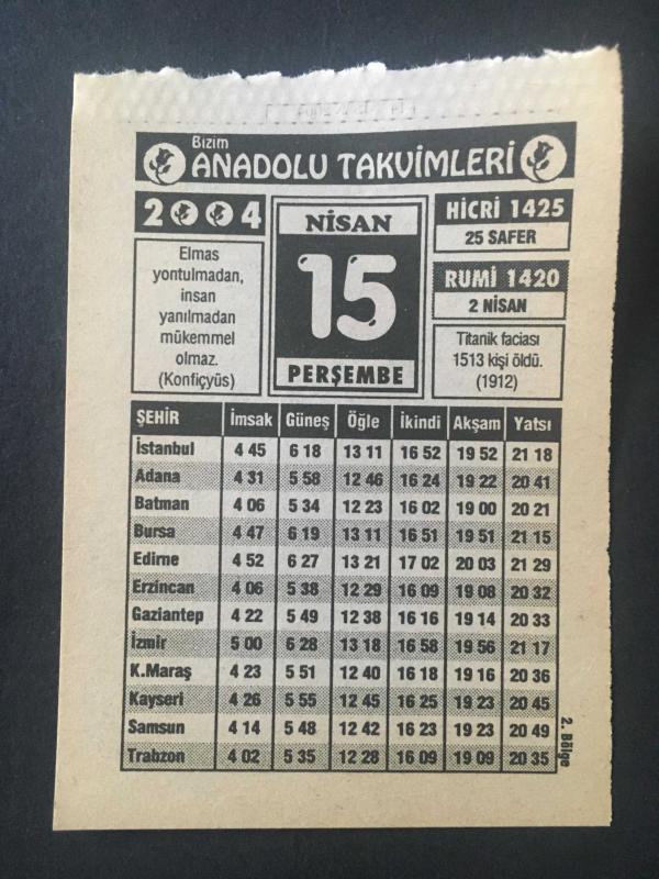 15 NİSAN 2004-TAKVİM YAPRAĞI,DOĞUM GÜNÜ HEDİYESİ-BİZİM ANADOLU TAKVİMLERİ,TİTANİK FACİASI 1513 KİŞİ ÖLDÜ 1912,BAHÇE DÜZENLENMESİ, en son 8 ay önce güncellenmiştir.