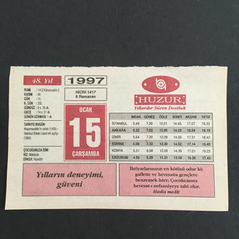 15 OCAK 1997-TAKVİM YAPRAĞI-DOĞUM GÜNÜ HEDİYESİ-HUZUR TAKVİMİ,AKŞEMSETTİNİN VEFATI,1459İSTANBUL ERKEK LİSESİNİN AÇILIŞI 1884,ÇOCUĞUNUZA İSİM,ORUCUN BİR HİKMETİ,YABANCI GÖZÜYLE