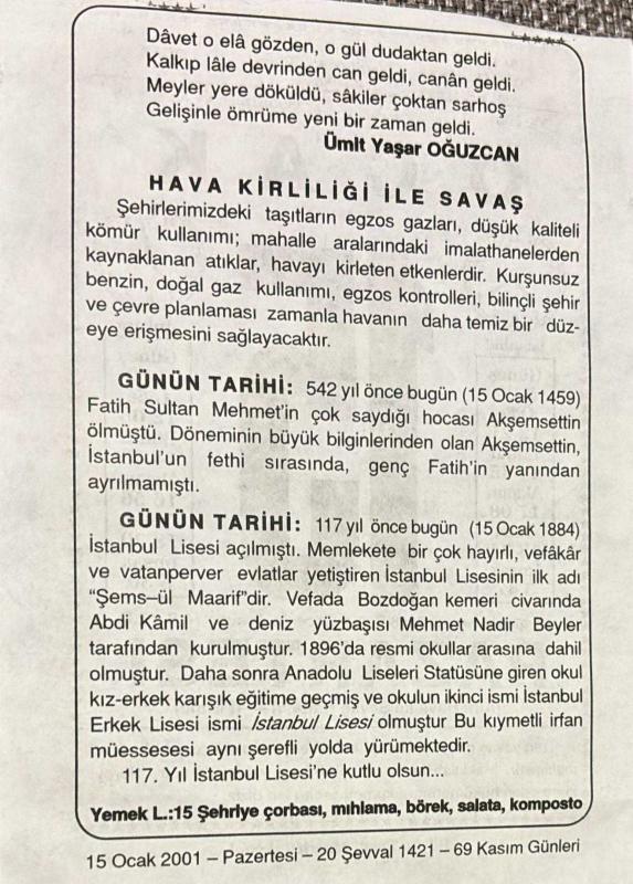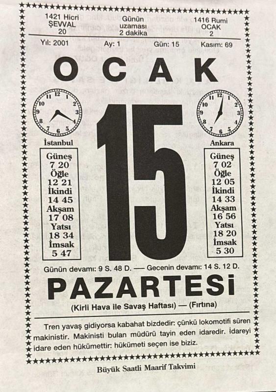 15 OCAK 2001 - TAKVİM YAPRAĞI - DOĞUM GÜNÜ HEDİYESİ - BÜYÜK SAATLİ MAARİF TAKVİMİ - KİRLİ HAVA İLE SAVAŞ HAFTASI - ÜMİT YAŞAR OĞUZCAN - AKŞEMSETTİN'İN VEFATI - İSTANBUL LİSESİNİN AÇILIŞI, en son 8 ay önce güncellenmiştir.