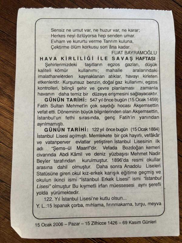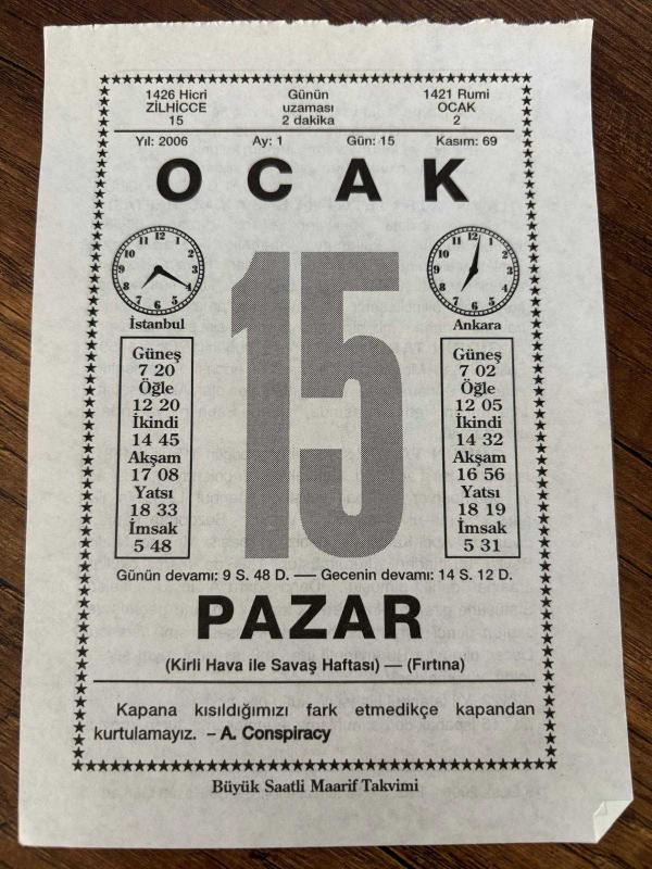 15 OCAK 2006 - TAKVİM YAPRAĞI - DOĞUM GÜNÜ HEDİYESİ - BÜYÜK SAATLİ MAARİF TAKVİMİ - A.CONSPİRACY - FUAT BAYRAMOĞLU - HAVA KİRLİLİĞİ İLE SAVAŞ HAFTASI - AKŞEMSETTİN'İN VEFATI - İSTANBUL LİSESİ'NİN AÇILIŞI, 3 ay önce satışa sunulmuştur.