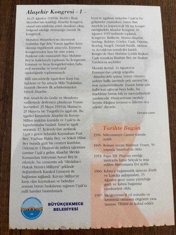 16 AĞUSTOS 2008 - TAKVİM YAPRAĞI - DOĞUM GÜNÜ HEDİYESİ - GAZİ MUSTAFA KEMAL ATATÜRK FOTOĞRAFLI BÜYÜKÇEKMECE BELEDİYESİ TAKVİMİ - Ulusal mücadele, yerelden bölgesele yükseliyor - Alaşehir Kongresi - 1 - 1556- Süleymaniye Camisi törenle açıldı - 1945- Roman yazarı Mahmut Yesari, 50 yaşında İstanbul'da öldü - 1953- Papa XII. Pius'un verdiği imtiyazla İzmir Selçuk'ta inşa edilen Meryemana Evi açıldı - 1997- İlköğretimin 8 yıl zorunlu ve kesintisiz olmasını öngören yasa BUYU tasarısı, TBMM'de kabul edildi, en son 9 ay önce güncellenmiştir.