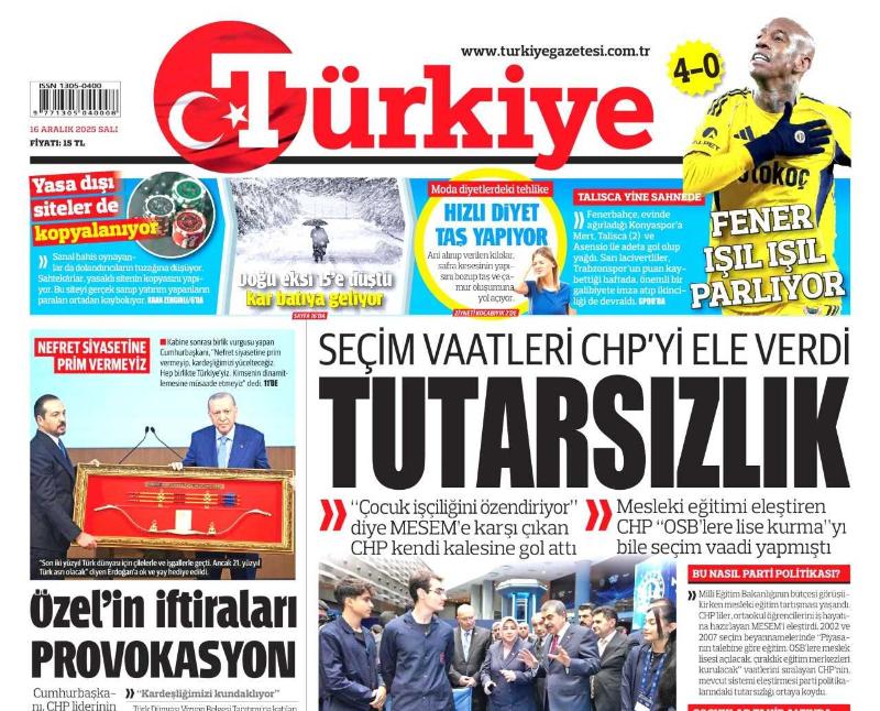 16 Aralık 2025 TÜRKİYE GAZETESİ Doğum Günü Gazetesi (16.12.2025) Doğumgünü Hediyesi | Sıradışı Hediye | Özel Gün Hediyeleri | GAZETE ARŞİVİ | CHP'ye Mülakat Tokadı | Bakan Fidan: SURİYE'DE İŞİMİZ YENİ BAŞLIYOR | Riskli Binaları Yenilemek İçin Ek Tedbirler Alınacak | RADARLAR TESPİT ETTİ F-16'LAR VURDU, en son 9 saat önce güncellenmiştir.