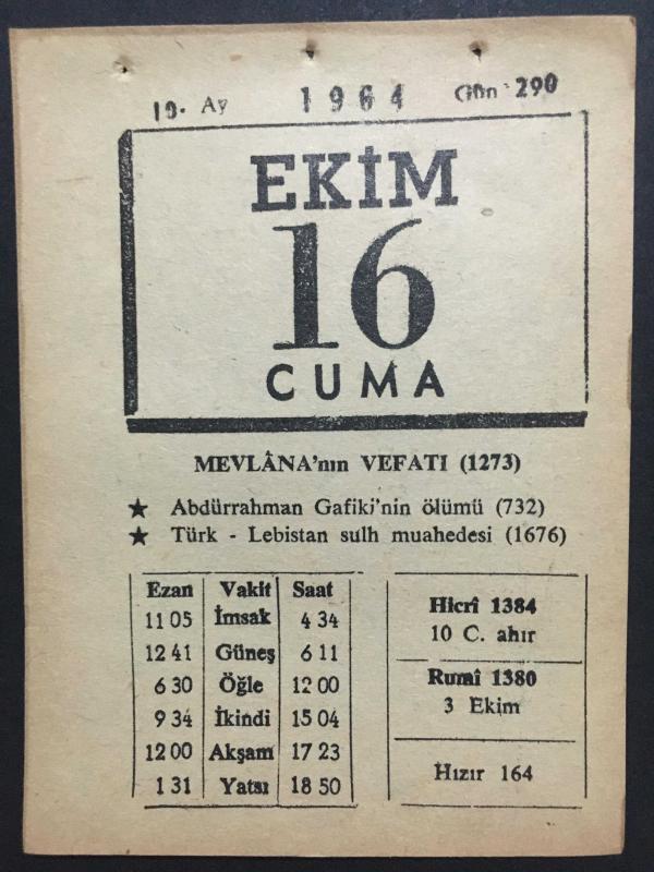 16 EKİM 1964-TAKVİM YAPRAĞI-DOĞUM GÜNÜ HEDİYESİ,MEVLANANIN VEVATI,1273,ABDURRAHMAN GAFİKİNİN ÖLÜMÜ 732,TÜRK LEHİSTAN SULH MUAHEDESİ,1676,HUTBE, en son 8 ay önce güncellenmiştir.
