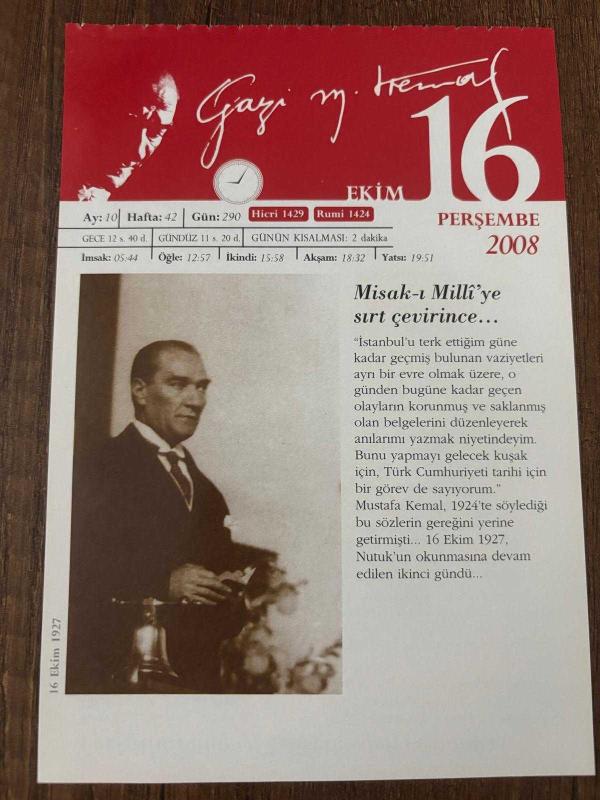 16 EKİM 2008 - TAKVİM YAPRAĞI - DOĞUM GÜNÜ HEDİYESİ - GAZİ MUSTAFA KEMAL ATATÜRK FOTOĞRAFLI BÜYÜKÇEKMECE BELEDİYESİ TAKVİMİ - Misak-ı Millî'ye sırt çevirince - Türk ulusunun en belirgin istek ve inancı - 1793- Fransa Kraliçesi Marie-Antoinette, giyotinle idam edildi - 1924- Topkapı Sarayı müze olarak ziyarete açıldı - 1940- Varşova gettosu Nazi SS birlikleri tarafından kuruldu - 2003- Mustafa Kemal portreleriyle tanınan Ressam Avni Arbaş 84 yaşında İzmir'de öldü, en son 9 ay önce güncellenmiştir.