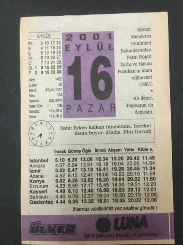 16 EYLÜL 2001-TAKVİM YAPRAĞI-DOĞUM GÜNÜ HEDİYESİ-ÜLKER TAKVİMİ,FATİN RÜŞTÜ ZORLU VE HASAN POLATKANIN İDAM EDİLMELERİ 1961,BİLEK BURKULMASI, en son 8 ay önce güncellenmiştir.