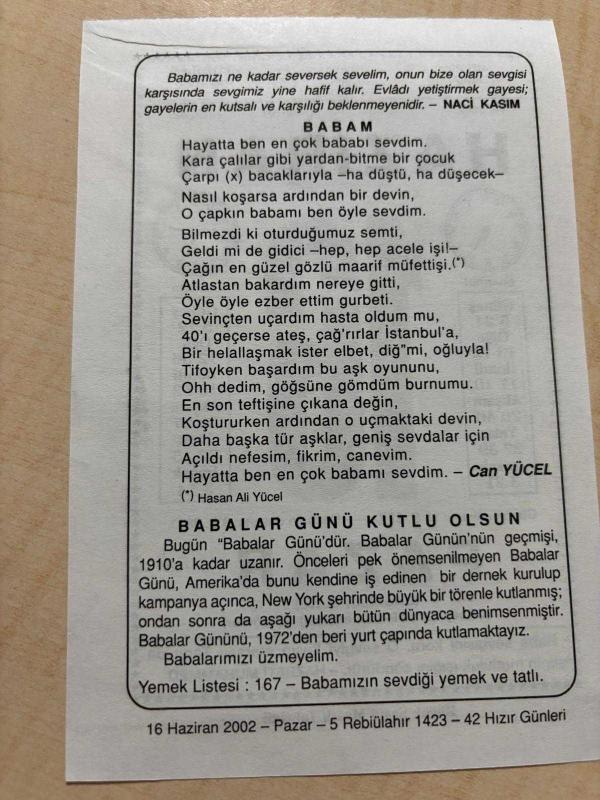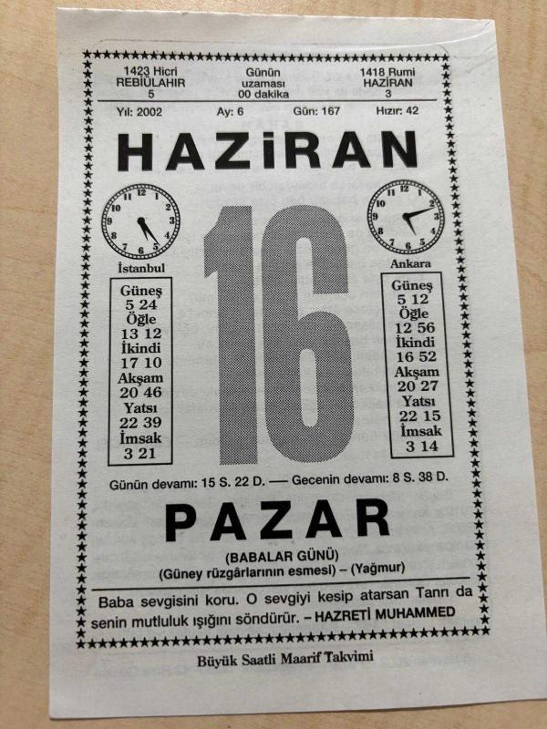 16 HAZİRAN 2002 - TAKVİM YAPRAĞI - DOĞUM GÜNÜ HEDİYESİ - BÜYÜK SAATLİ MAARİF TAKVİMİ - HZ.MUHAMMED - NACİ KASIM - CAN YÜCEL - BABALAR GÜNÜ KUTLU OLSUN, en son 8 ay önce güncellenmiştir.