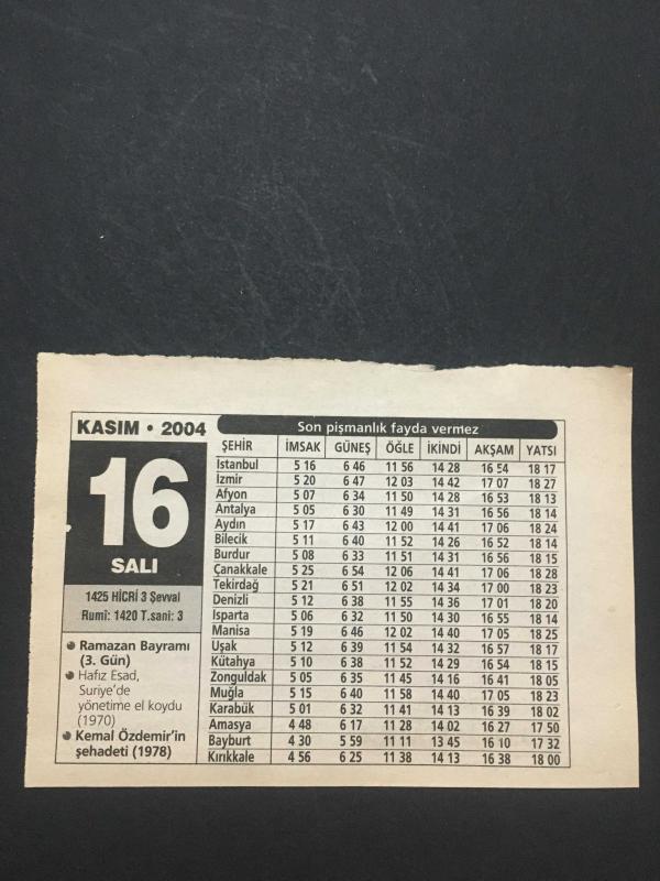 16 KASIM 2004-TAKVİM YAPRAĞI-DOĞUM GÜNÜ HEDİYESİ,RAMAZAN BAYRAMI 3. GÜN HAFIZ ESAD,SURİYEDE YÖNETİME EL KOYDU 1970,KEMAL ÖZDEMİRİN ŞEHADETİ 1978,SELAMLAŞMANIN ADABI başlıklı ürün, Efemera, Müzik, Sinema > Belge ve Evraklar > Takvimler kategorisi altında İkinci El olarak satılmaktadır.