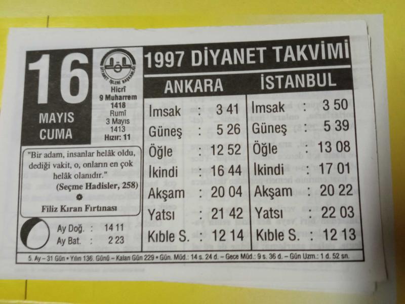 16 Mayıs 1997 takvim yaprağı (Diyanet Takvimi), en son 1 yıl önce güncellenmiştir.