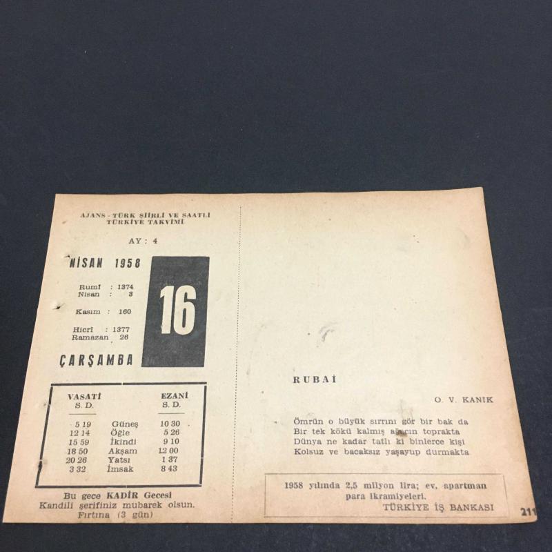 16 NİSAN 1958 -TAKVİM YAPRAĞI-DOĞUM GÜNÜ HEDİYESİ- AJANS-TÜRK ŞİİRLİ VE SAATLİ TÜRKİYE TAKVİMİ,O.V.KANIK,SELAHATTİN BATU,FAL,FIKRA,ANATOLE FRANCENİN DOĞUMU 1844,GÜZEL SÖZ,YEMEK LİSTESİ, 1 yıl önce satışa sunulmuştur.