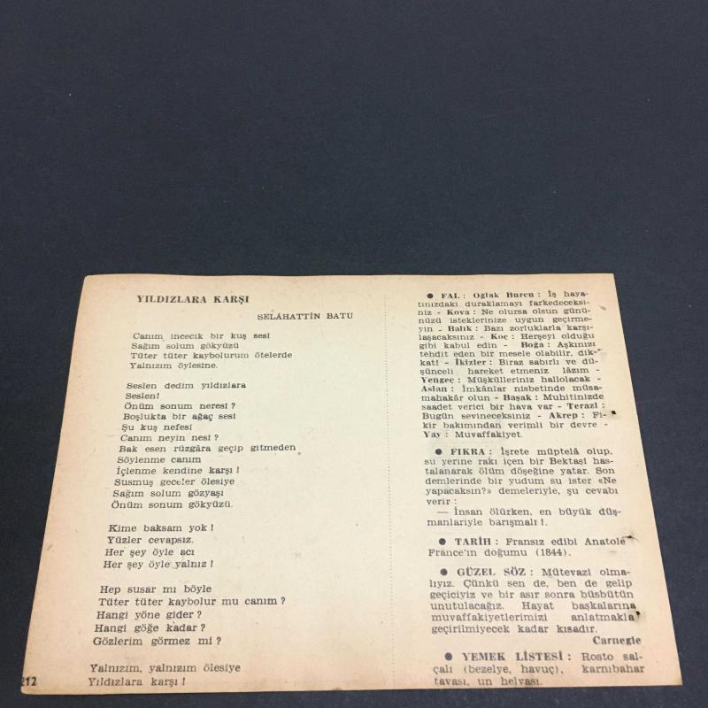 16 NİSAN 1958 -TAKVİM YAPRAĞI-DOĞUM GÜNÜ HEDİYESİ- AJANS-TÜRK ŞİİRLİ VE SAATLİ TÜRKİYE TAKVİMİ,O.V.KANIK,SELAHATTİN BATU,FAL,FIKRA,ANATOLE FRANCENİN DOĞUMU 1844,GÜZEL SÖZ,YEMEK LİSTESİ başlıklı ürün, Efemera, Müzik, Sinema > Belge ve Evraklar > Takvimler kategorisi altında İkinci El olarak satılmaktadır.