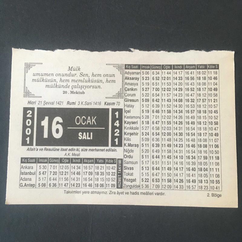 16 OCAK 2001 -TAKVİM YAPRAĞI-DOĞUM GÜNÜ HEDİYESİ-HİZMET TAKVİMİ,DÜNYA VE AHİRET SAADETİ İÇİN İBADET, en son 8 ay önce güncellenmiştir.