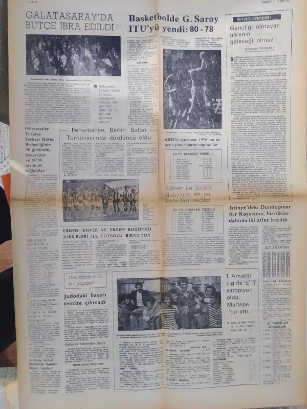 16 Ocak 1977 - Cumhuriyet Gazetesi - Galatasaray'da bütçe ibra edildi - Basketbolda, Galatasaray, İTÜ'yü yendi: 80-78 - Fenerbahçe, Berlin Salon Turnuvası'nda dördüncü oldu - ABD'li uzmanlar 1976'nın en hızlı yüzücülerini saptadılar - 1. Amatör Lig'de İETT şampiyon oldu, Maltepe ''tur attı'' - Judodaki başarı temize çıkmadı - İstinye'deki Dumlupınar Kır Koşusuna, büyükler dalında iki atlet katıldı Gazete tam değildir sadece 2 sayfası mevcuttur - Tek yaprak arkalı önlüdür adlı eser, Kitap > Süreli Yayınlar > Gazeteler > Türkiye > Genel > Günlük kategorisinde İkinci El olarak satıştadır.