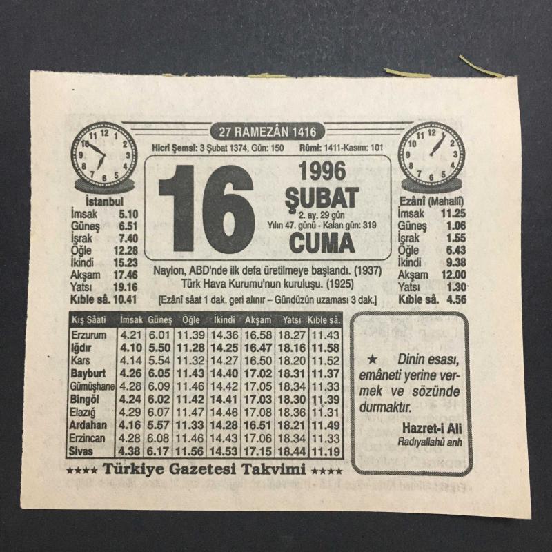 16 ŞUBAT 1996 -TAKVİM YAPRAĞI-DOĞUM GÜNÜ HEDİYESİ-TÜRKİYE GAZETESİ TAKVİMİ,NAYLON ABD DE İLK DEFA ÜRETİLMEYE BAŞLANDI 1937,TÜRK HAVA KURUMUNUN KURULUŞU 1925,FITRA VERMEK RAMAZAN MANİLERİ