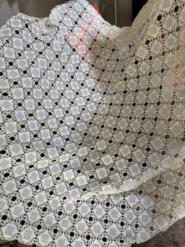 70 numara çapadan yapılmış ortaları kanaviçe olarak petit point olmaya elverişli 160x160 cm hiç kullanılmamış çeyiz işi dantel masa örtüsü. Renk kırık beyaz.