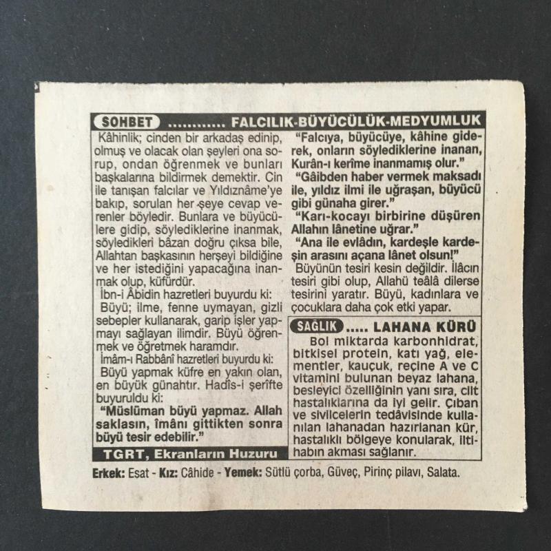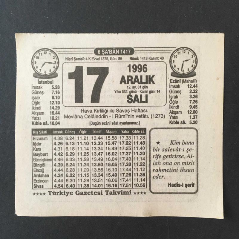 17 ARALIK 1996 -TAKVİM YAPRAĞI-DOĞUM GÜNÜ HEDİYESİ-TÜRKİYE GAZETESİ TAKVİMİ,HAVA KİRLİLİĞİYLE SAVAŞ HAFTASI,MEVLANA CELALEDDİNİ RUMİ NİN VEFATI 1273,FALCILIK BÜYÜCÜLÜK MEDYUMCULUK,LAHANA KÜRÜ başlıklı ürün, Efemera, Müzik, Sinema > Belge ve Evraklar > Takvimler kategorisi altında İkinci El olarak satılmaktadır.