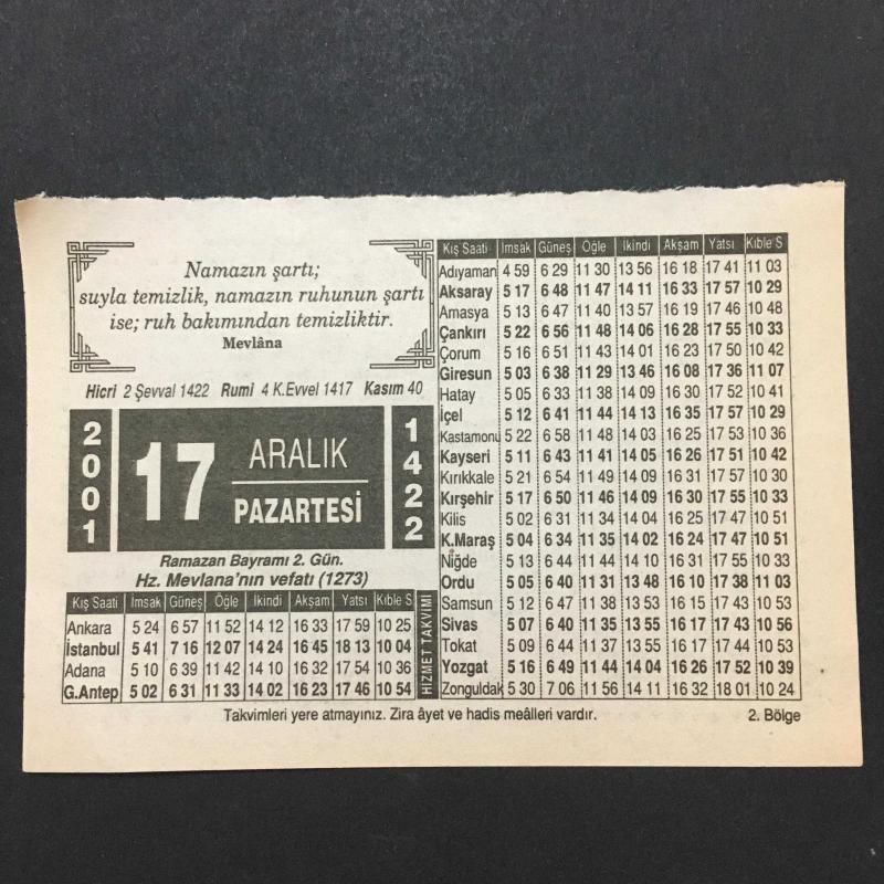 17 ARALIK 2001-TAKVİM YAPRAĞI-DOĞUM GÜNÜ HEDİYESİ- HİZMET TAKVİMİ,HZ.MEVLANANIN VEFATI 1273,DÜNYEVİ ÇALIŞMALARIN İBADET HÜKMÜNE GEÇTİĞİNE DAİR başlıklı ürün, Efemera, Müzik, Sinema > Belge ve Evraklar > Takvimler kategorisi altında İkinci El olarak satılmaktadır.